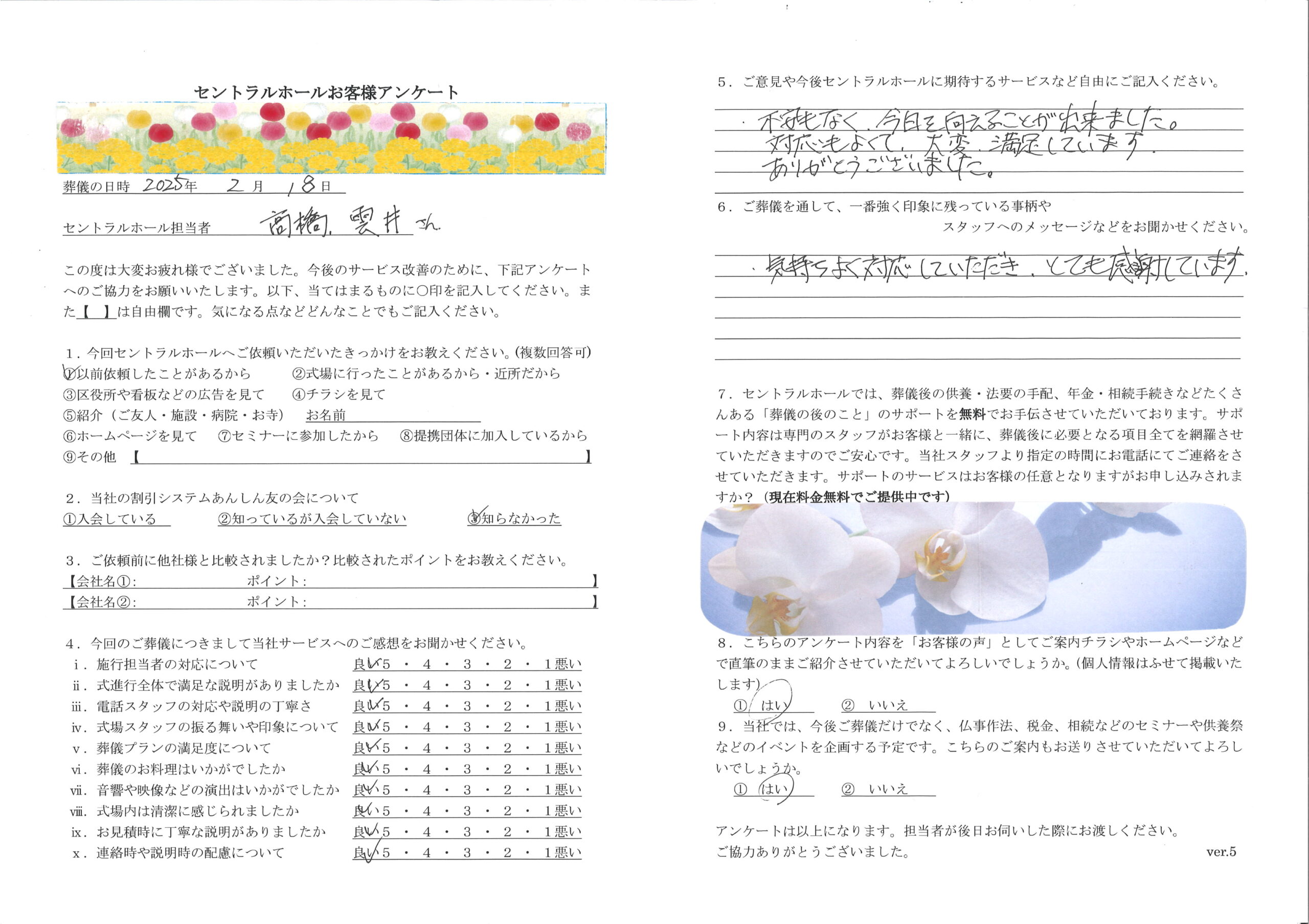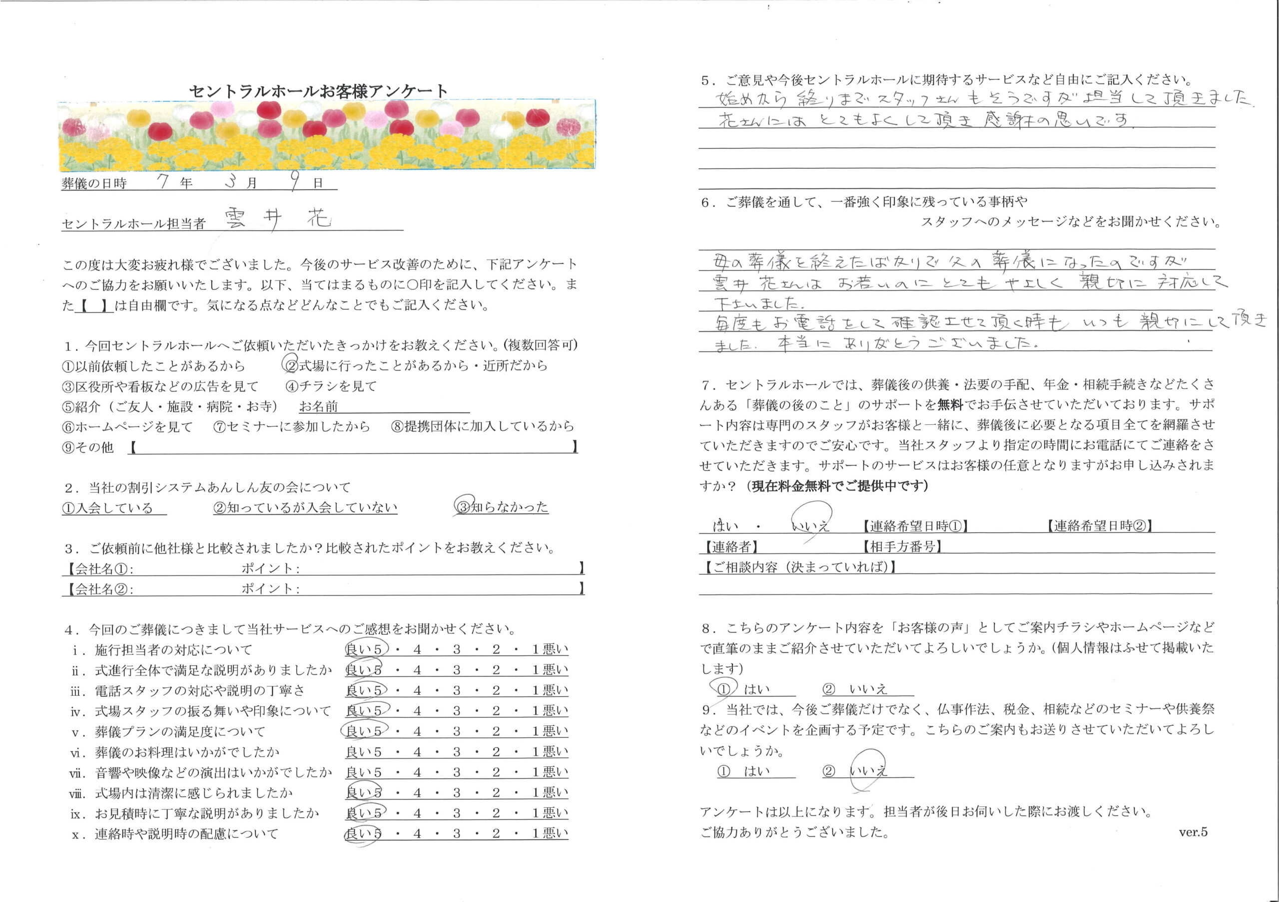 母の葬儀を終えたばかりで父の葬儀になったのですが、雲井さんはお若いのにとてもやさしく親切に対応してくださいました。 何度もお電話をして確認させていただく時も、いつも親切にしてくださいました。 本当にありがとうございました。