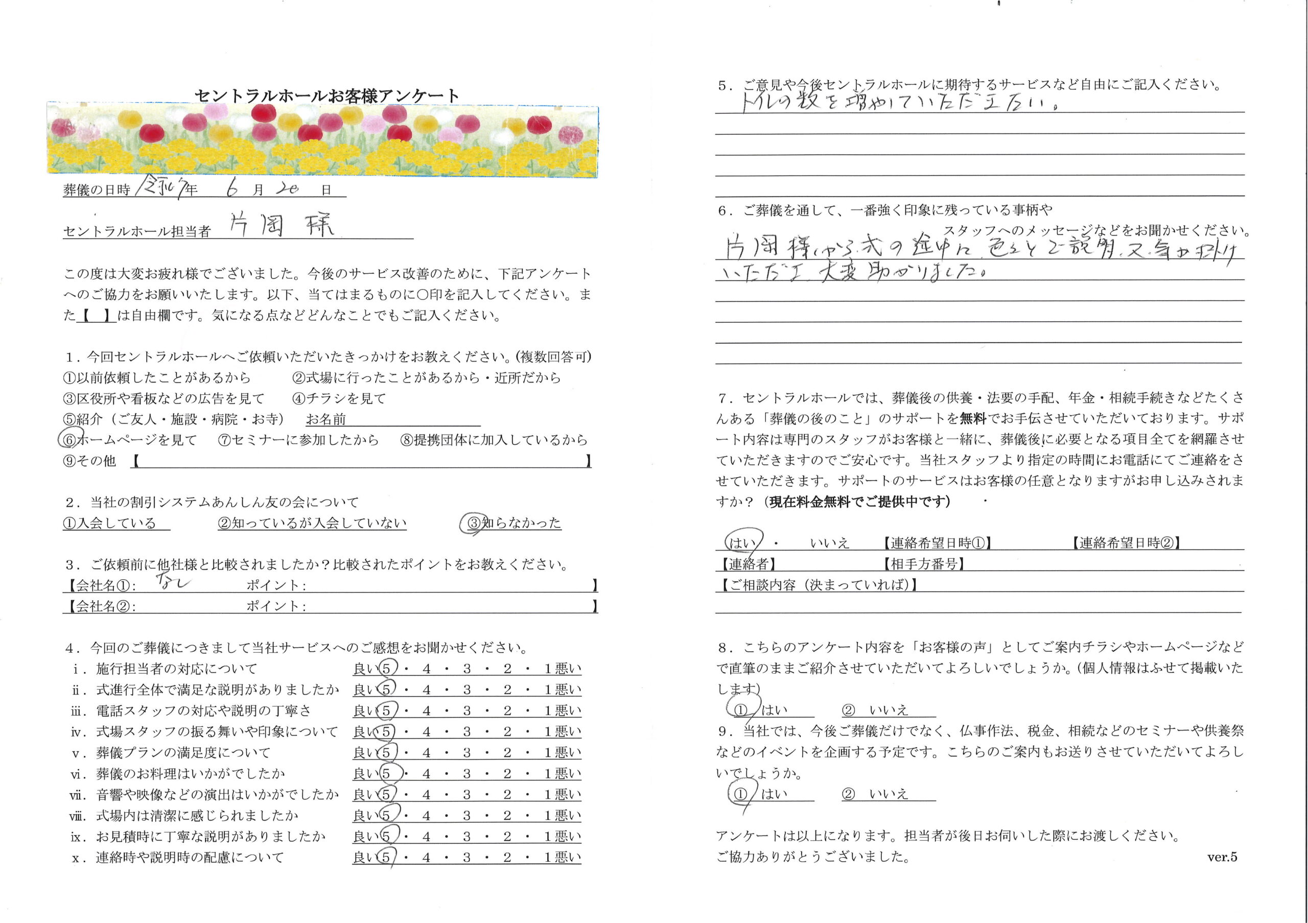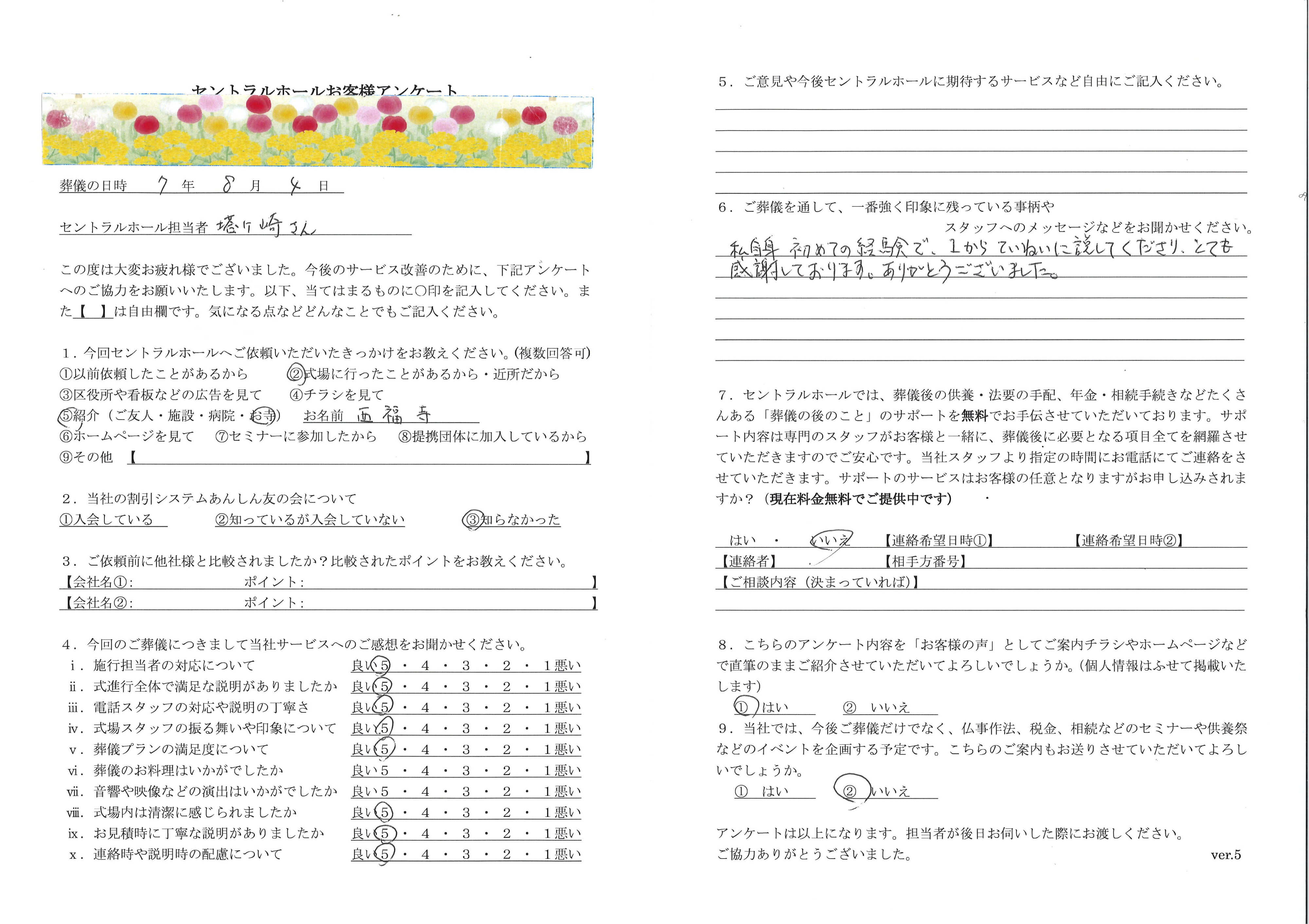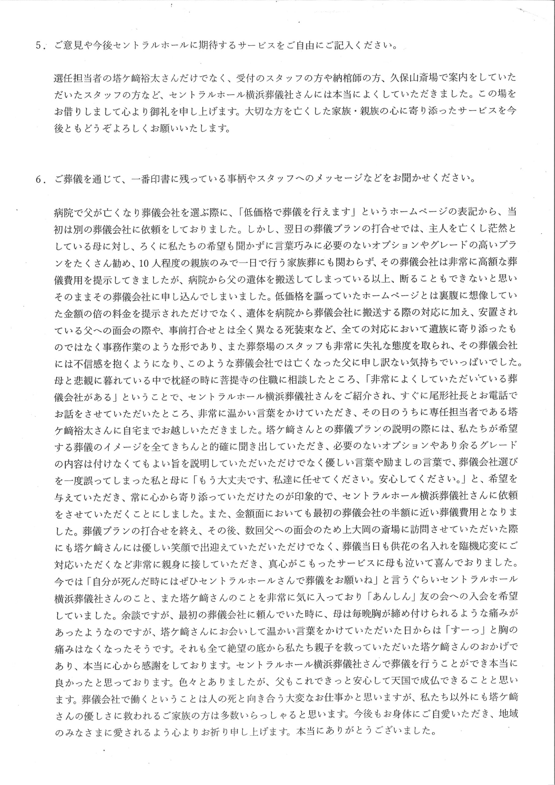 病院で父が亡くなり葬儀会社を選ぶ際に、「低価格で葬儀を行えます」というホームページの表記から、当初は別の葬儀会社に依頼をしておりました。しかし、翌日の葬儀プランの打合せでは、主人を亡くし茫然としている母に対し、ろくに私たちの希望も聞かずに言葉巧みに必要のないオプションやグレードの高いプランをたくさん勧め、10人程度の親族のみで一日で行う家族葬にも関わらず、その葬儀会社は非常に高額な葬儀費用を提示してきましたが、病院から父の遺体を搬送してしまっている以上、断ることもできないと思いそのままその葬儀会社に申し込んでしまいました。低価格を謳っていたホームページとは裏腹に想像していた金額の倍の料金を提示されただけでなく、遺体を病院から葬儀会社に搬送する際の対応に加え、安置されている父への面会の際や、事前打合せとは全く異なる死装束など、全ての対応において遺族に寄り添ったものではなく事務作業のような形であり、また葬祭場のスタッフも非常に失礼な態度を取られ、その葬儀会社には不信感を抱くようになり、このような葬儀会社では亡くなった父に申し訳ない気持ちでいっぱいでした。 母と悲観に暮れている中で枕経の時に菩提寺の住職に相談したところ、「非常によくしていただいている葬儀会社がある」ということで、セントラルホール横浜葬儀社さんをご紹介され、すぐに尾形社長とお電話でお話をさせていただいたところ、非常に温かい言葉をかけていただき、その日のうちに専任担当者である塔ケ崎裕太さんに自宅までお越しいただきました。塔ケ崎さんとの葬儀プランの説明の際には、私たちが希望する葬儀のイメージを全てきちんと的確に聞き出していただき、必要のないオプションやあり余るグレードの内容は付けなくてもよい旨を説明していただいただけでなく優しい言葉や励ましの言葉で、葬儀会社選びを一度誤ってしまった私と母に「もう大丈夫です、私達に任せてください。安心してください。」と、希望を与えていただき、常に心から寄り添っていただけたのが印象的で、セントラルホール横浜葬儀社さんに依頼 をさせていただくことにしました。また、金額面においても最初の葬儀会社の半額に近い葬儀費用となりました。葬儀プランの打合せを終え、その後、数回父への面会のため上大岡の斎場に訪問させていただいた際にも塔ケ崎さんには優しい笑顔で出迎えていただいただけでなく、葬儀当日も供花の名入れを臨機応変にご対応いただくなど非常に親身に接していただき、真心がこもったサービスに母も泣いて喜んでおりました。 今では「自分が死んだ時にはぜひセントラルホールさんで葬儀をお願いね」と言うぐらいセントラルホール横浜葬儀社さんのこと、また塔ケ崎さんのことを非常に気に入っており「あんしん」友の会への入会を希望していました。余談ですが、最初の葬儀会社に頼んでいた時に、母は毎晩胸が締め付けられるような痛みがあったようなのですが、塔ケ崎さんにお会いして温かい言葉をかけていただいた日からは「すーっ」と胸の痛みはなくなったそうです。それも全て絶望の底から私たち親子を救っていただいた塔ケ崎さんのおかげであり、本当に心から感謝をしております。セントラルホール横浜葬儀社さんで葬儀を行うことができ本当に良かったと思っております。色々とありましたが、父もこれできっと安心して天国で成仏できることと思います。葬儀会社で働くということは人の死と向き合う大変なお仕事かと思いますが、私たち以外にも塔ケ崎 さんの優しさに救われるご家族の方は多数いらっしゃると思います。今後もお身体にご自愛いただき、地域のみなさまに愛されるよう心よりお祈り申し上げます。本当にありがとうございました。