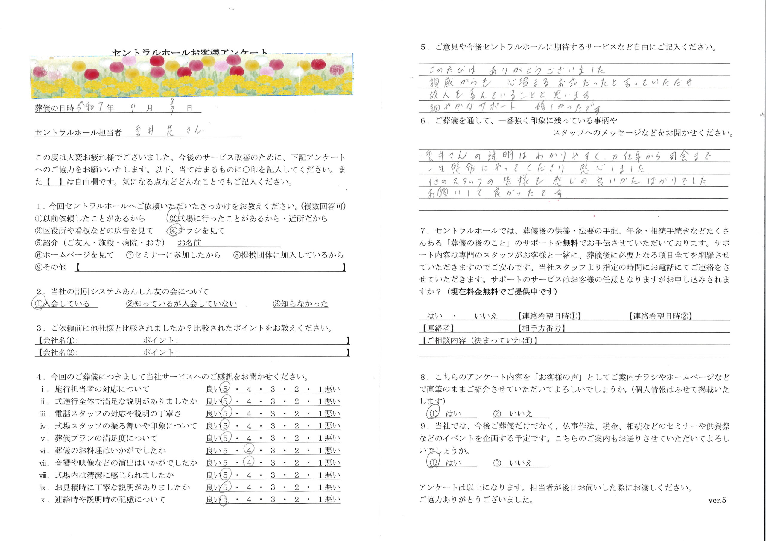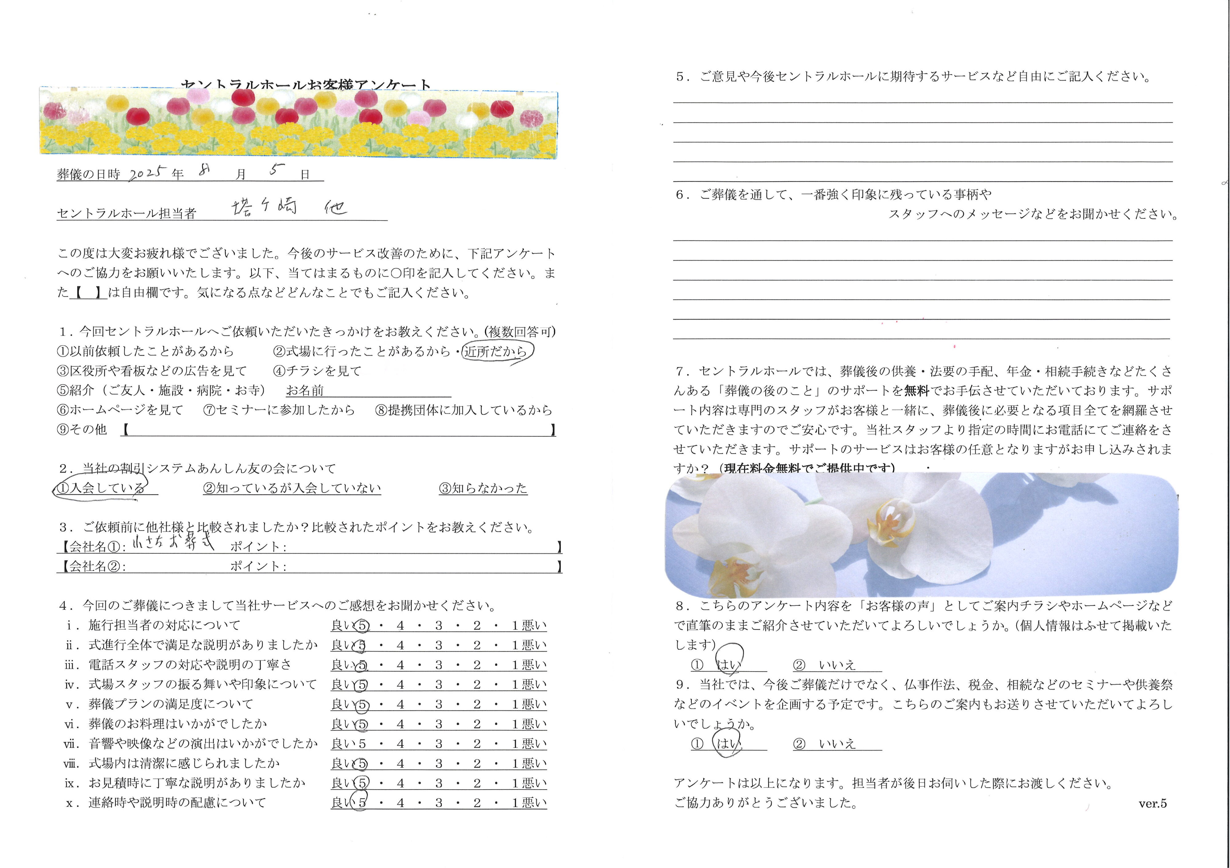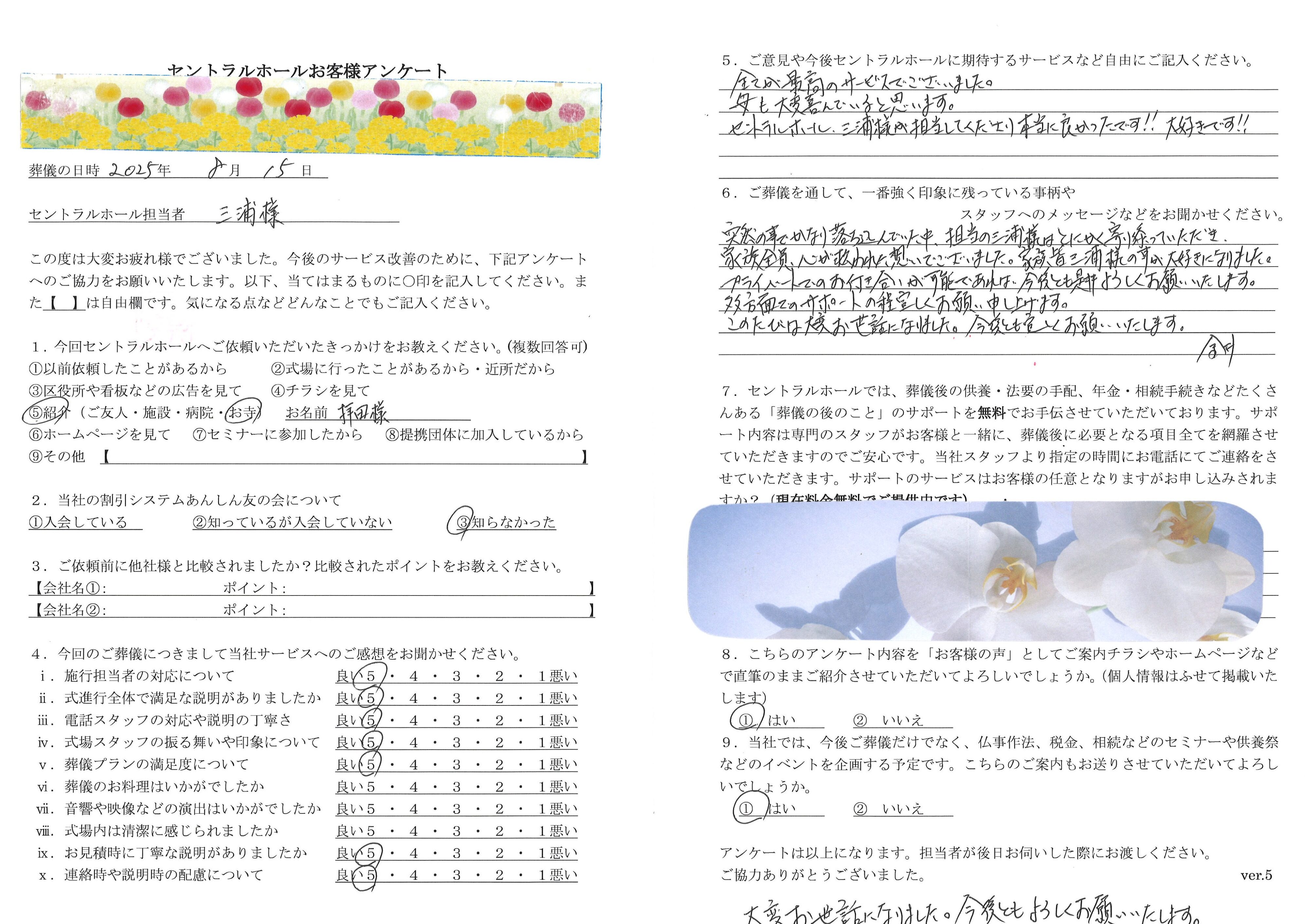 三浦さんのことが大好きになりました! 2025-08-15 セントラルホール上大岡駅前式場 様 プラン 火葬式(直葬) 人数 15 人 葬儀全体の満足度 90 点 担当者の対応 100 点 突然の事でかなり落ち込んでいた中、担当の三浦様はとにかく寄り添っていただき、家族全員心が救われた想いでございました。家族皆、三浦様のことが大好きになりました! プライベートでのお付き合いが可能であれば、今後とも是非よろしくお願いします。 多方面でのサポートの程よろしくお願い申し上げます。 この度は、大変お世話になりました。今後ともよろしくお願いいたします。